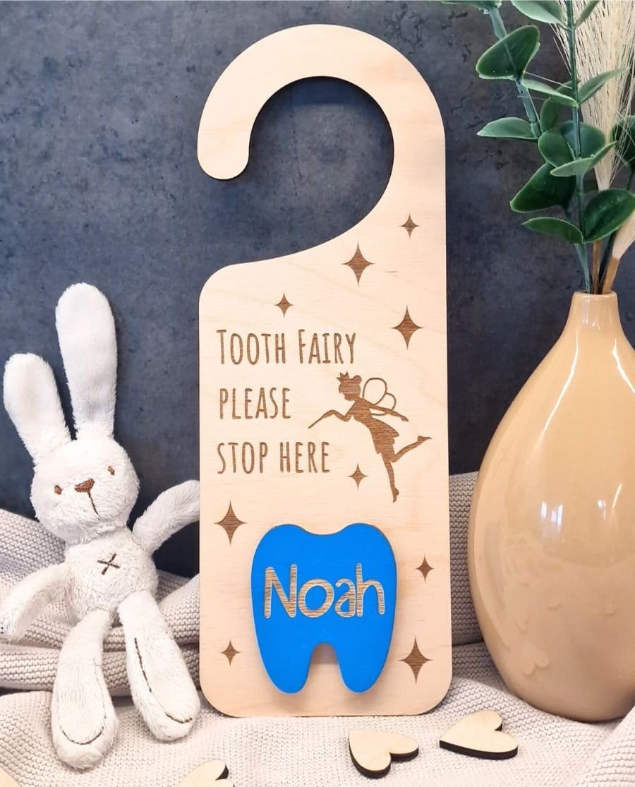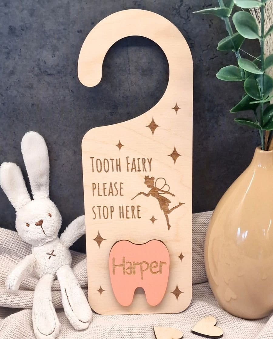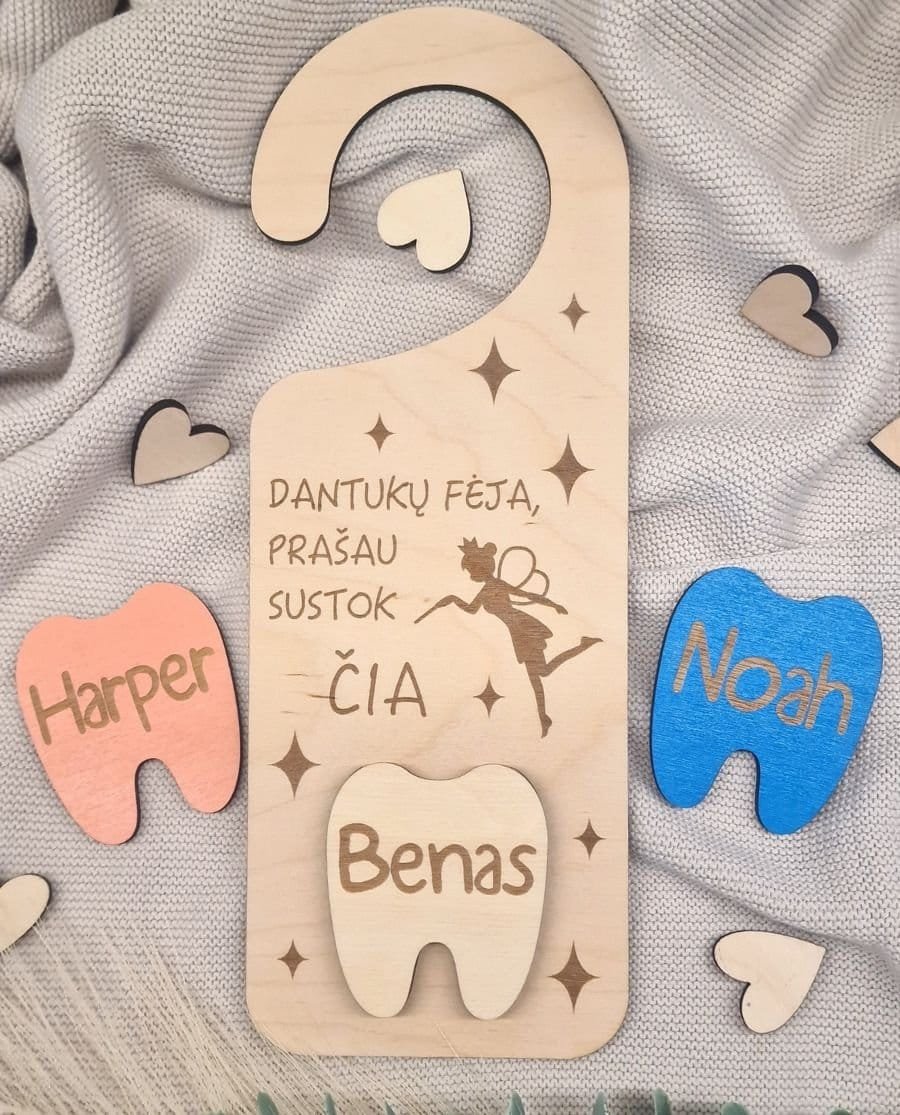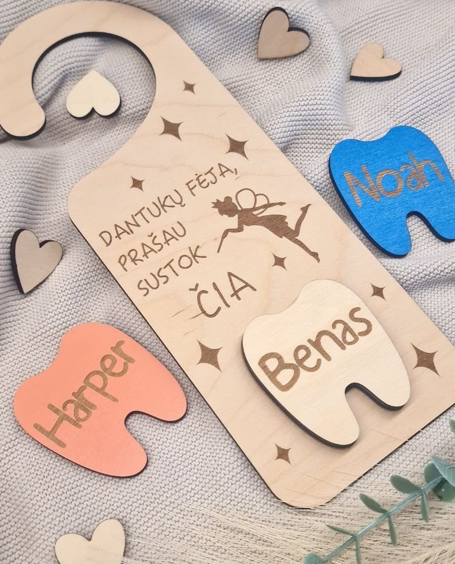 Ši miela ir unikali dantukų fėjos durų lentelė yra puikus būdas sukurti magišką atmosferą vaiko kambaryje! Pagaminta iš natūralaus 3 mm storio faneros, ji suteikia jaukumo ir žaismingumo. Lentelę lengva pakabinti ant durų rankenos ar sienos, o jos subtilus dizainas džiugins tiek vaikus, tiek tėvus.